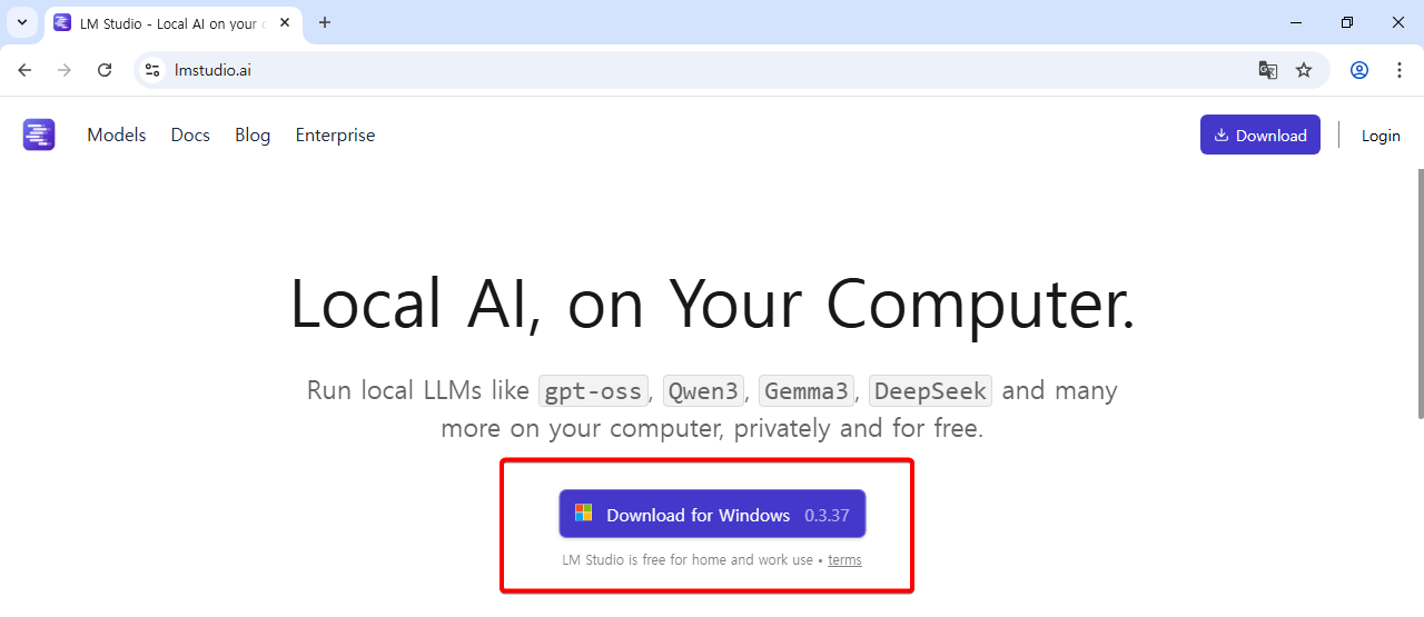 https://lmstudio.ai 사이트에 접속해 [Download for Windows] 버튼을 클릭해 파일을 다운로드받는다.