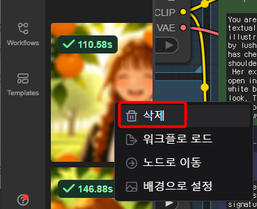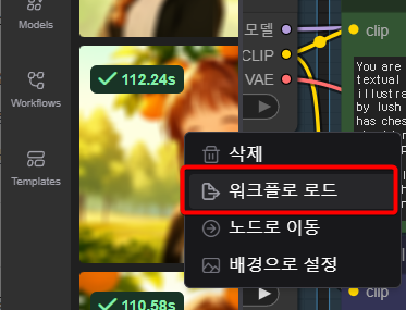 결과물 이미지, 동영상 등을 오른쪽 클릭한 후 “워크플로 로드” 버튼