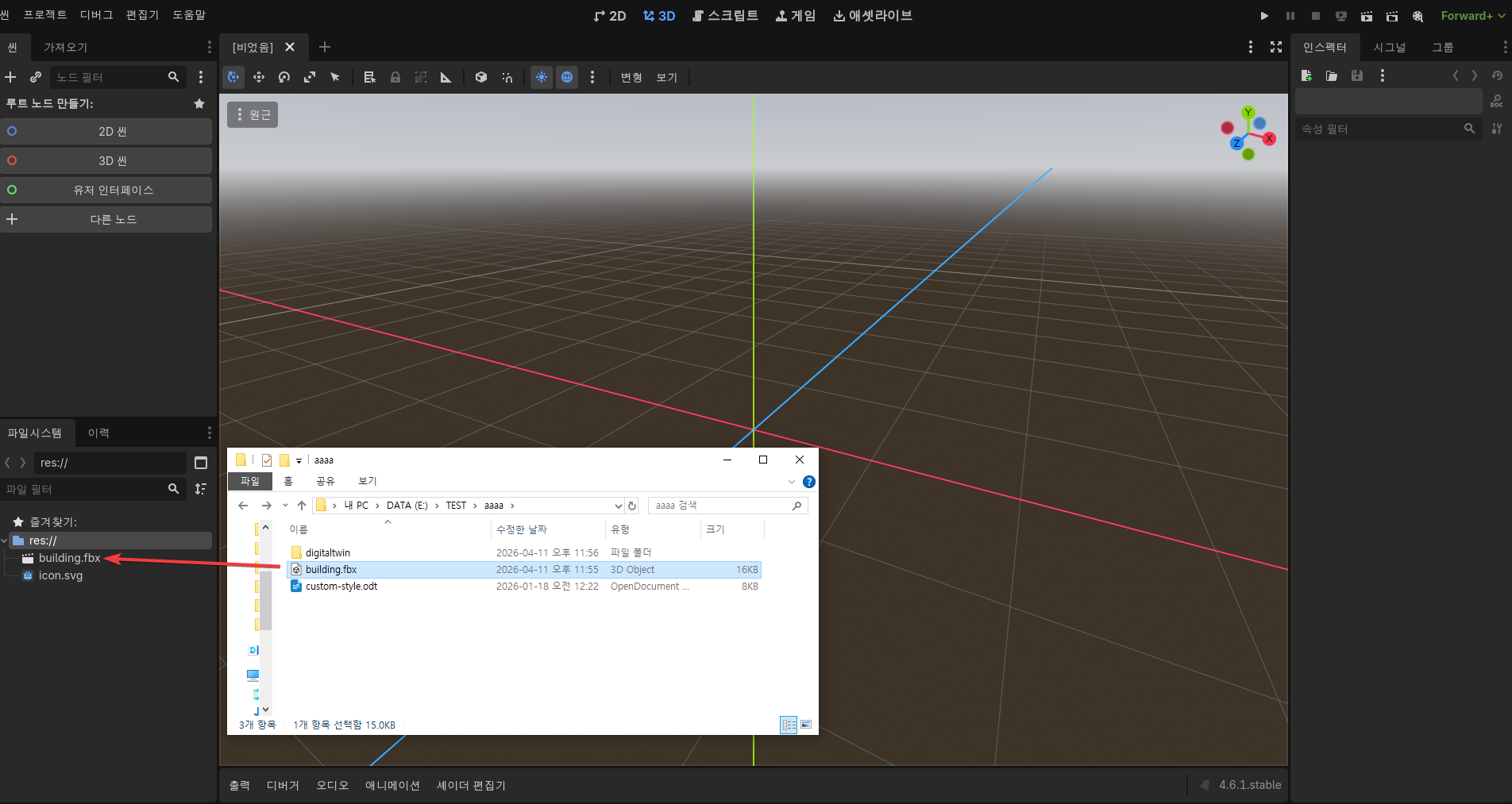 탐색기의 building.fbx 파일을 끌어다 godot 엔진의 res 아래에 끌어 놓는다(Drag and Drop).