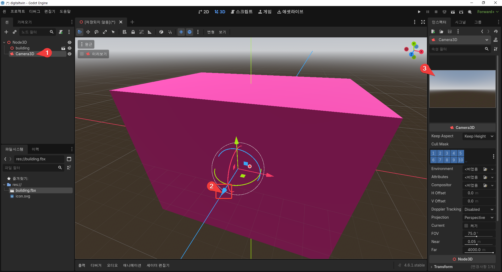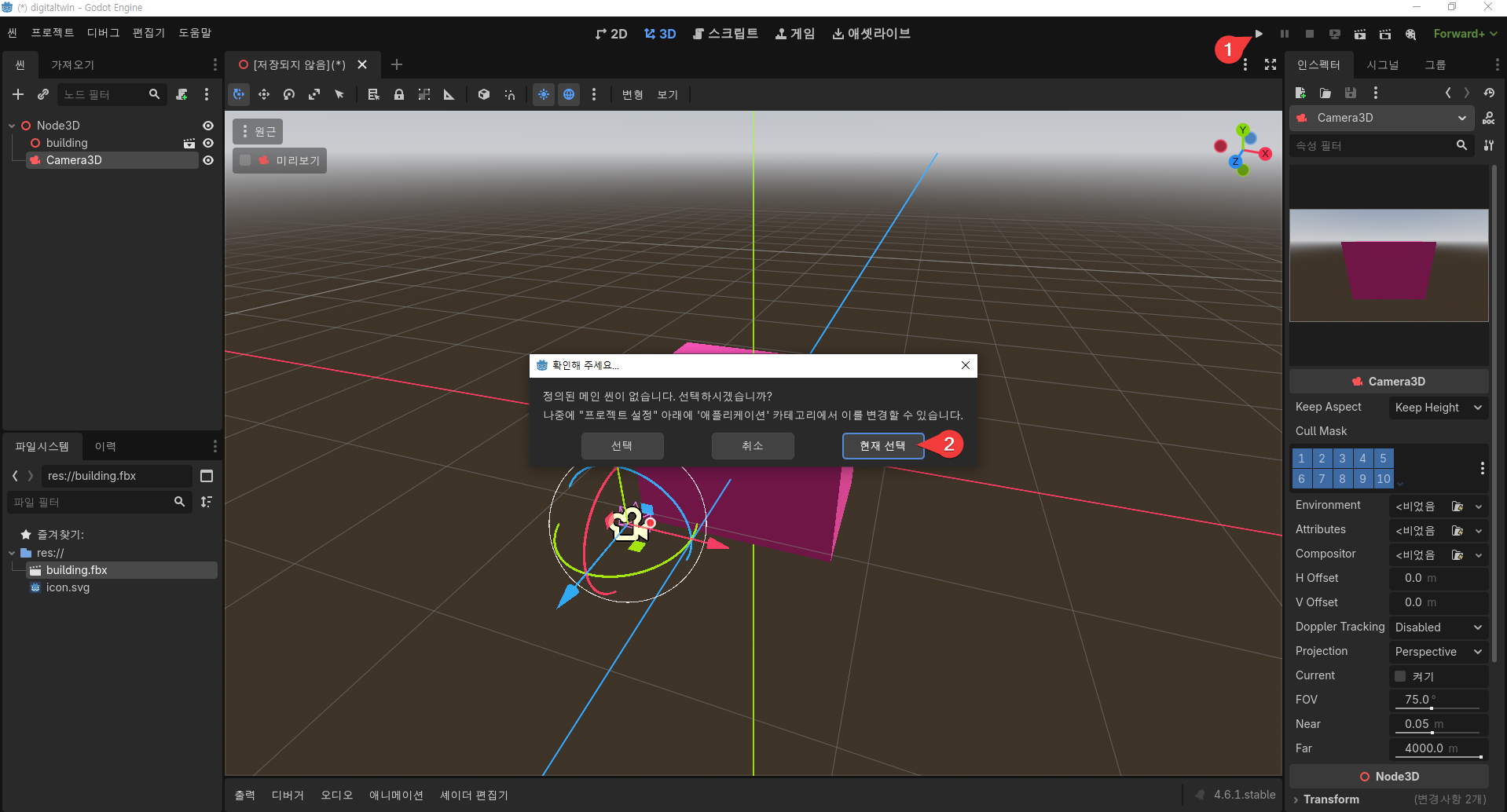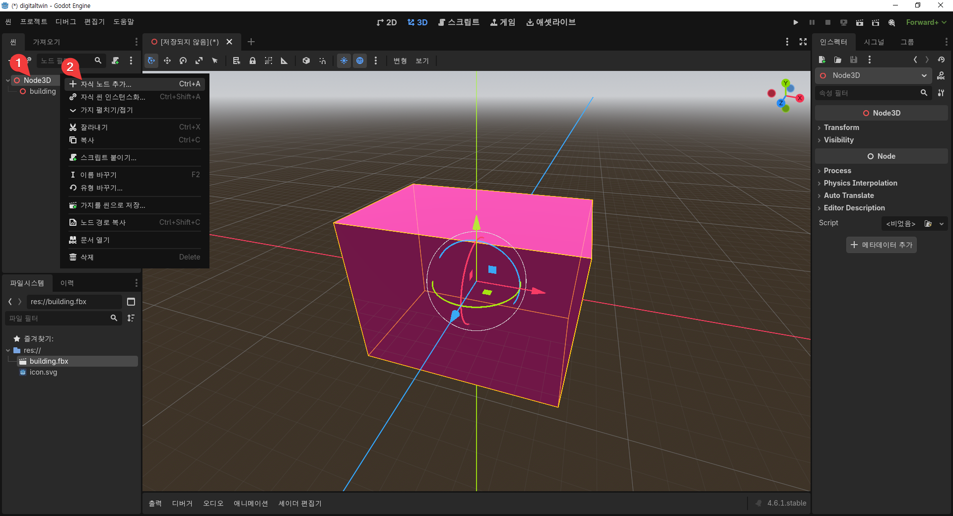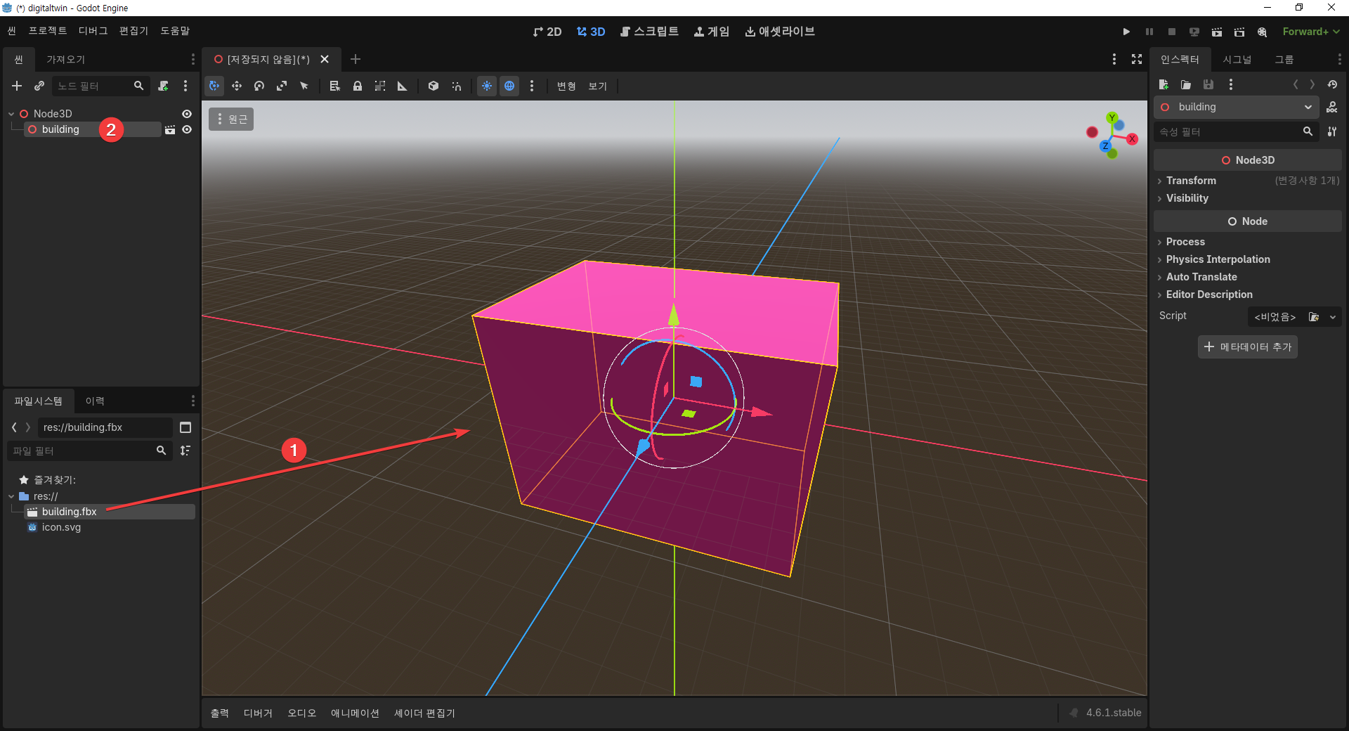 res:// 밑의 building.fbx를 오른쪽 3D 공간 안에 끌어다 놓는다(drag and drop).