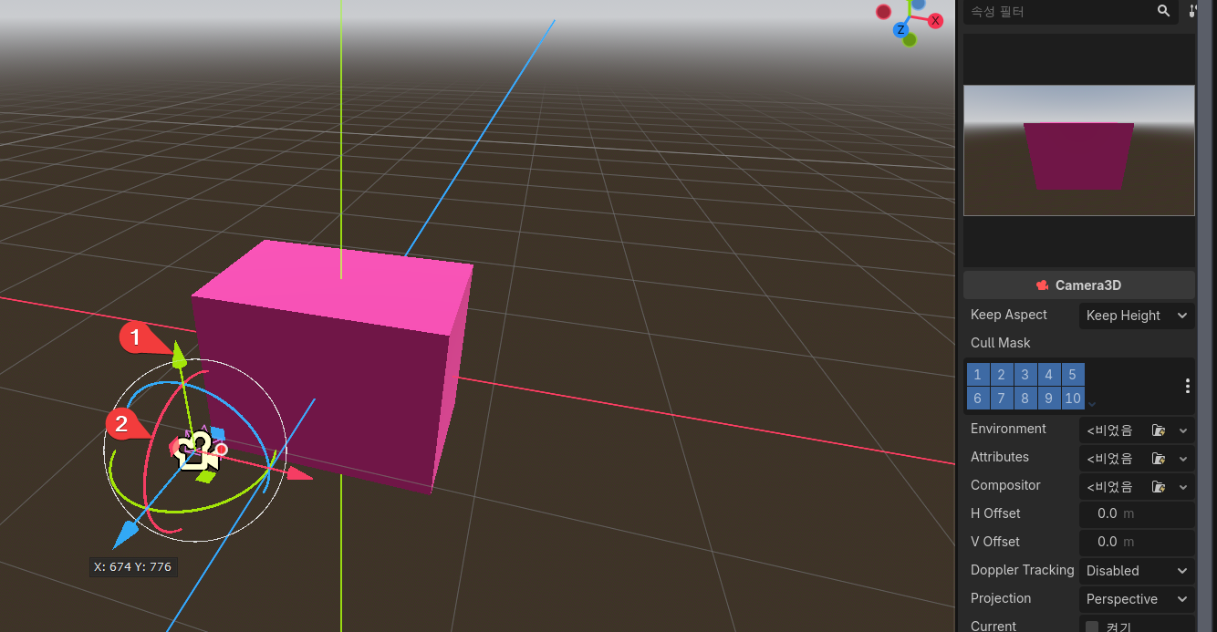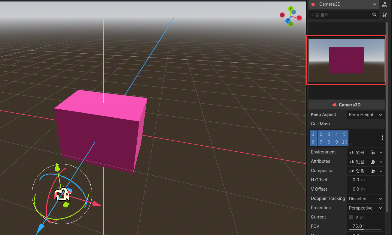 카메라의 초록색 화살표를 잡고(누른 채로) 위로 올린다. 카메라가 위로 올라간다.