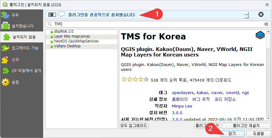 ’플러그인을 성공적으로 설치했다’는 메시지 확인 후