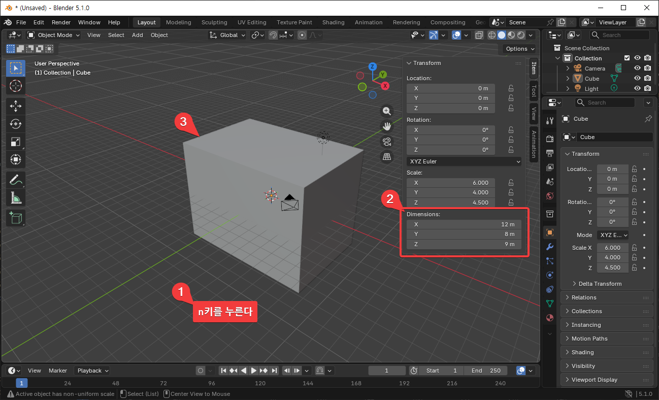 블렌더 실행 후 블렌더의 빈 공간을 한 번 클릭하고 n키를 누른다.