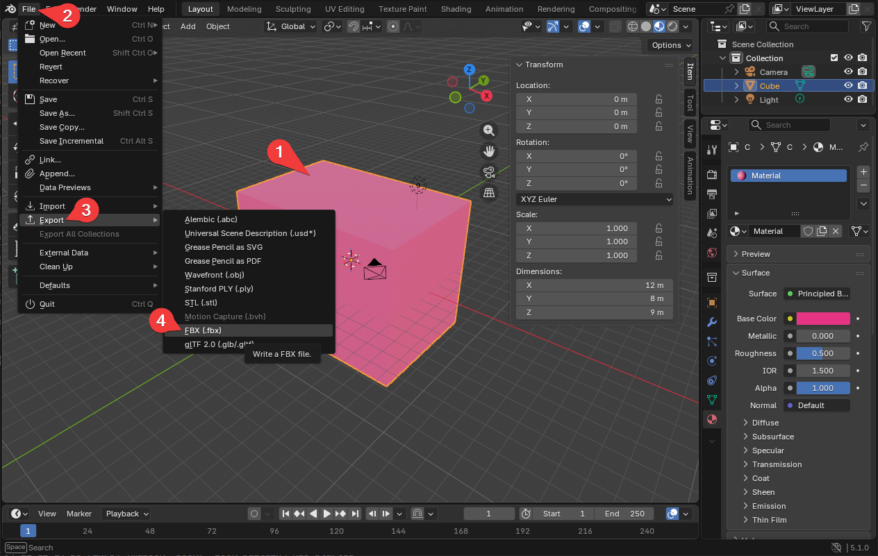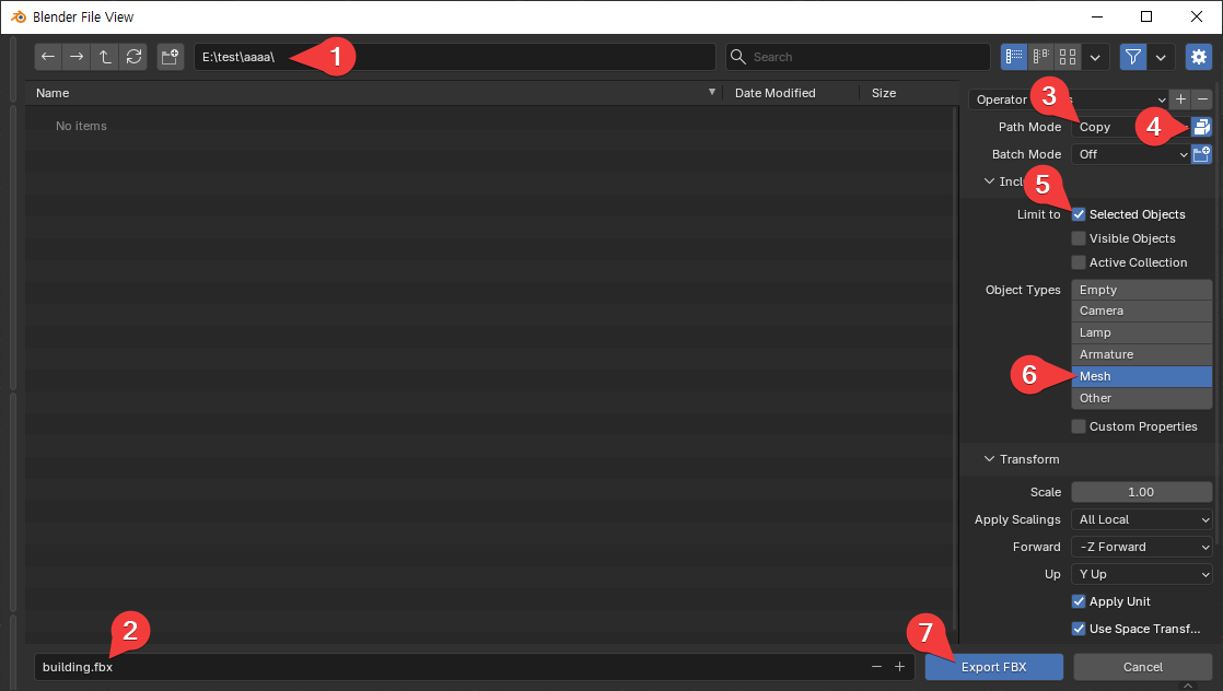 만든 건물을 digital twin, cesium 등에서 사용하기 위해서는 FBX 파일로 내보내야 한다.