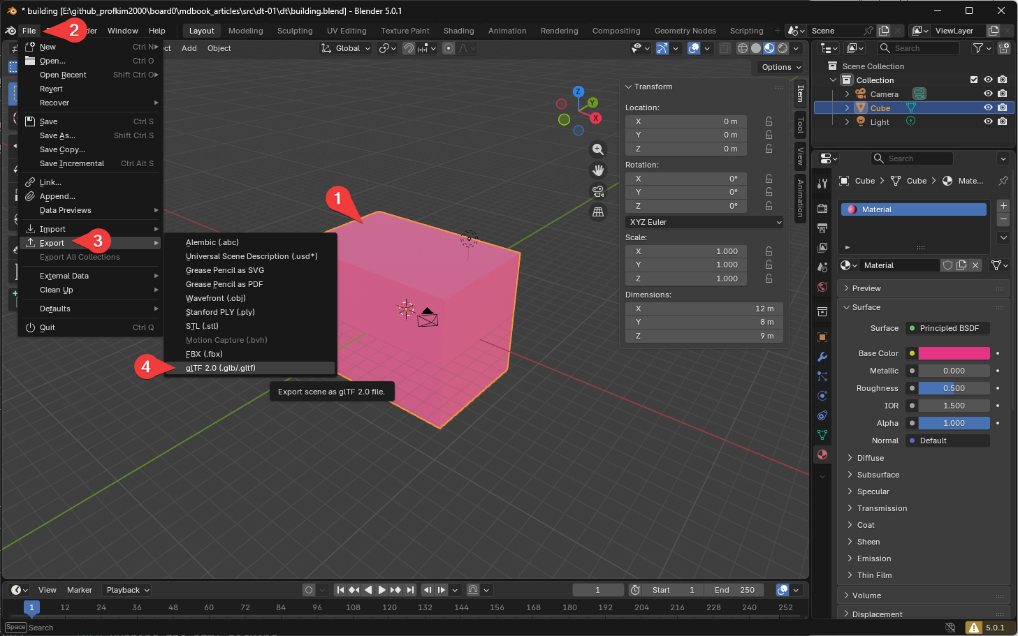 glTF 2.0(.glb/.gltf 메뉴를 선택한다.)