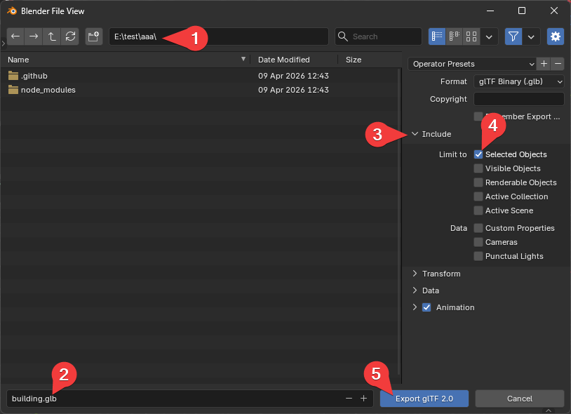 “Export glTF 2.0” 버튼을 눌러 실제 glb로 내보내기를 실행한다.